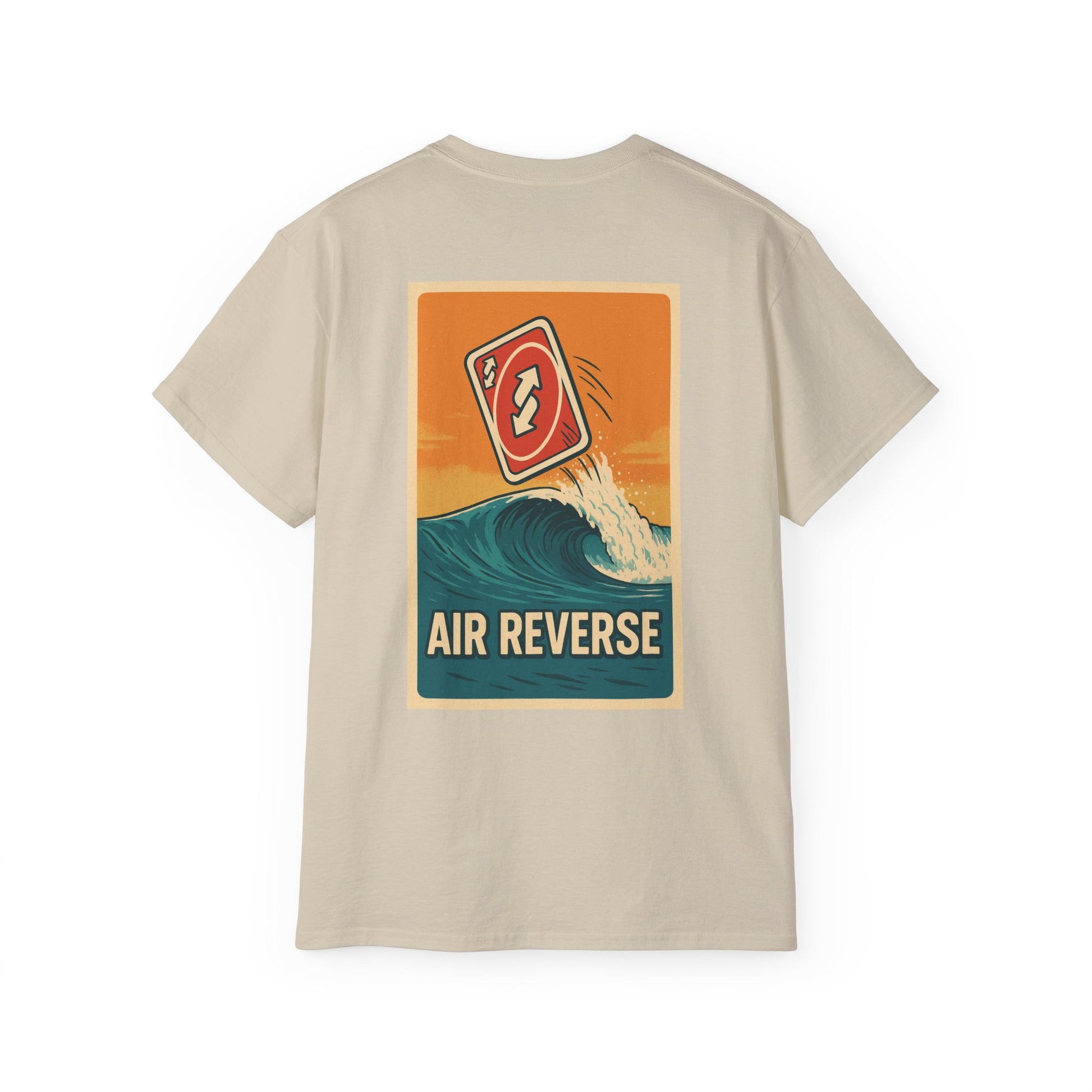 This T-shirt features a design inspired by a surfing maneuver called the air reverse, but instead of a board/person, there is an uno reverse card. It gives off a playful and laid-back vibe, perfect for casual wear. Ideal for adults, this tee is perfect for summer parties, beach outings, or any casual occasion.