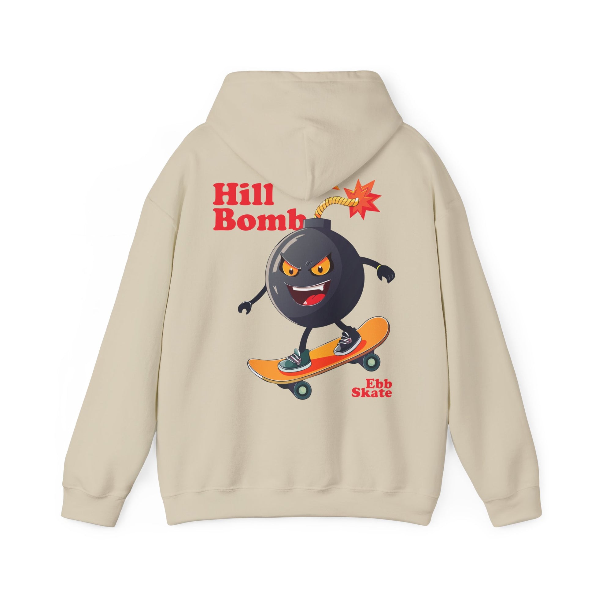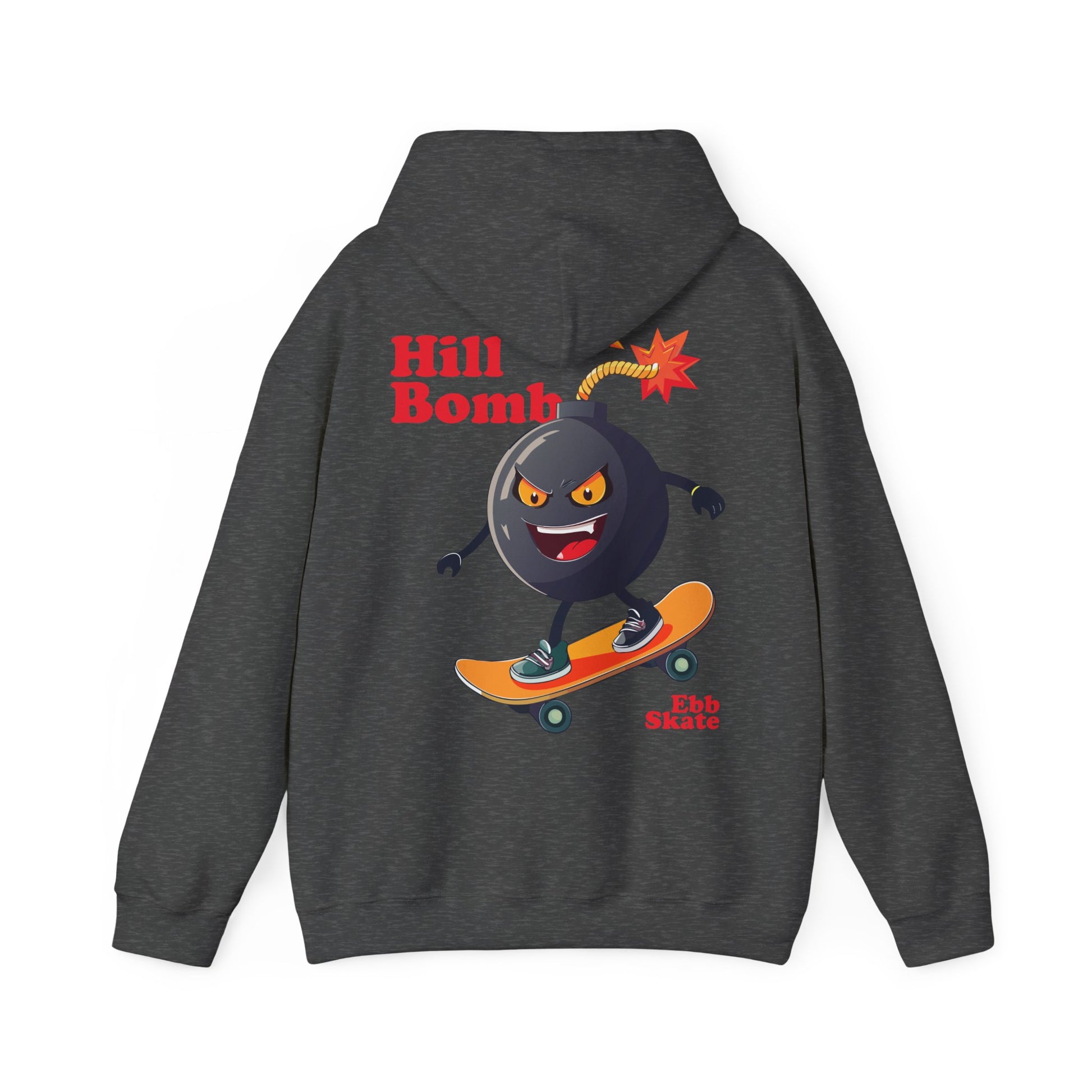 This hoodie features a bomb cartoon on a skateboard, symbolizing a 'Hill Bomb' reference. It gives off a cool, urban vibe and is perfect for skateboard enthusiasts. Ideal for casual wear or as a statement piece during skateboarding events.